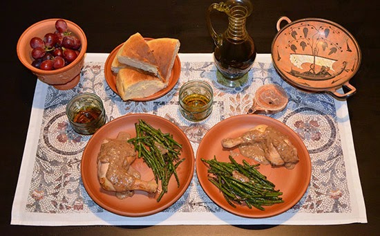 | PULLUM NUMIDICUM (pollo numidico), CONCHICLA CUM FABA (fagioli al cumino), CONDITUM PARADOXUM (vino rosso speziato) |