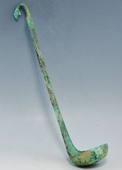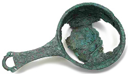 (Cyathus) Vasetto in bronzo con ansa sormontante, provvisto di un unico manico, forse per misurare la farina e il grano.