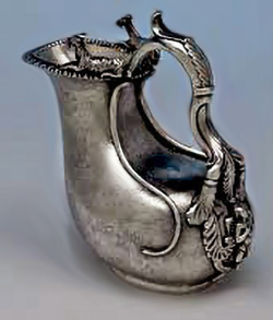 Quello in foto ha una forma di fiasca con il corpo decorato da motivo fogliaceo, ansa a voluta, base esagonale su quattro piedi cilindrici e lungo becco impostato obliquamente.