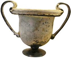 Coppa profonda con due anse, in bronzo, argento o oro. In età orientalizzante sono documentate a Preneste, in Etruria e in Campania. Per bere e brindare.